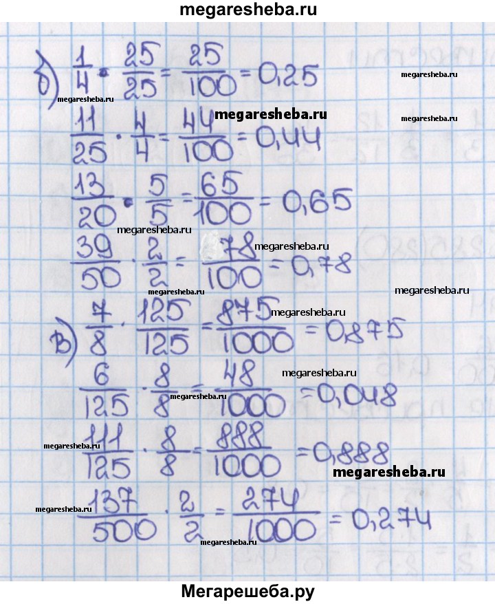 281. Запишите в виде десятичной дроби, приведя: a) 1/2, 1/5 и 4/5 к знаменателю 10; б) 1/4; 11/25; 13/20, 39/50 к знаменателю 100; в) 7/8; 6/125; 111/125; 137/500 к знаменателю 1000.