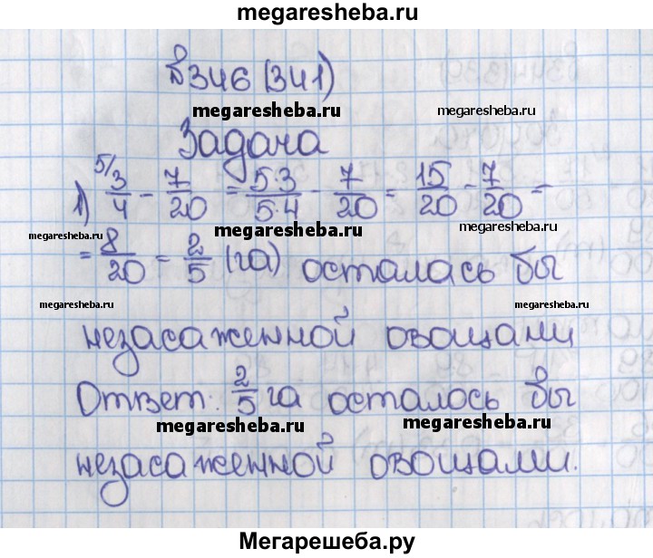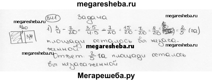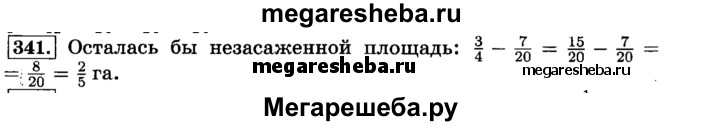 341. При посадке овощей после одного дня работы остались незасаженными 3/4 га поля. Какая площадь осталась бы незасаженной, если бы в этот день овощи высадили на площади, большей на 7/20 га?
