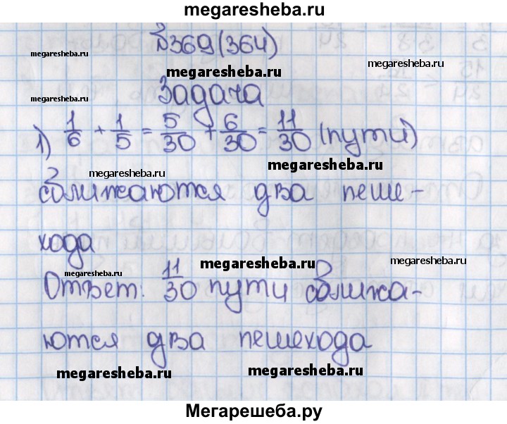 364. Из пунктов А и В одновременно навстречу друг другу вышли два пешехода. Один из них за 1 ч проходит 1/6 расстояния АВ, а другой — 1/5 расстояния АВ. На какую часть расстояния АВ они сближаются каждый час?
