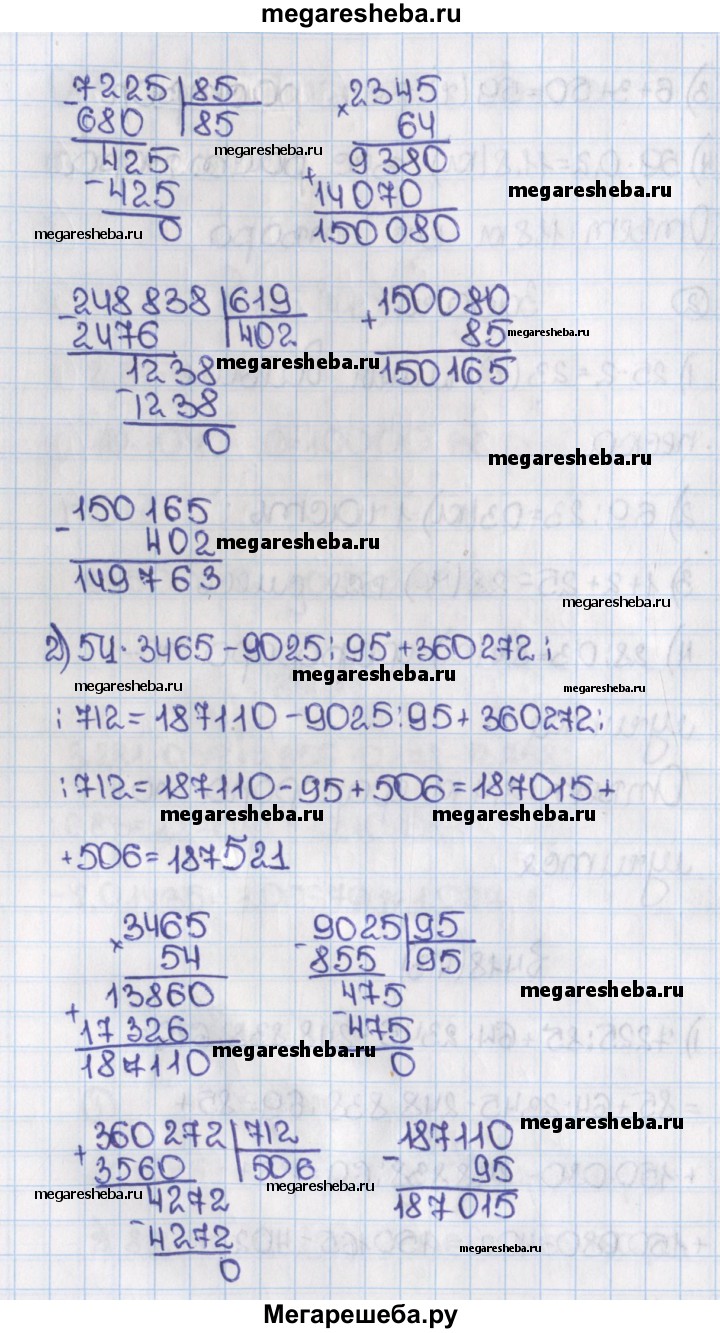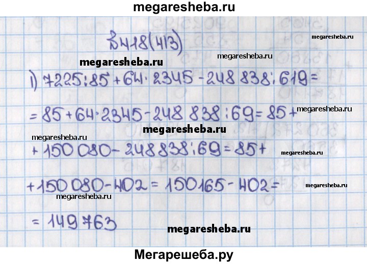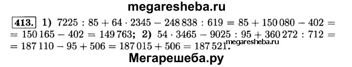 413. Выполните действия: 1) 7225 : 85 + 64 * 2345 - 248 838 : 619; 2) 54 * 3465 - 9025 : 95 + 360 272 : 712.