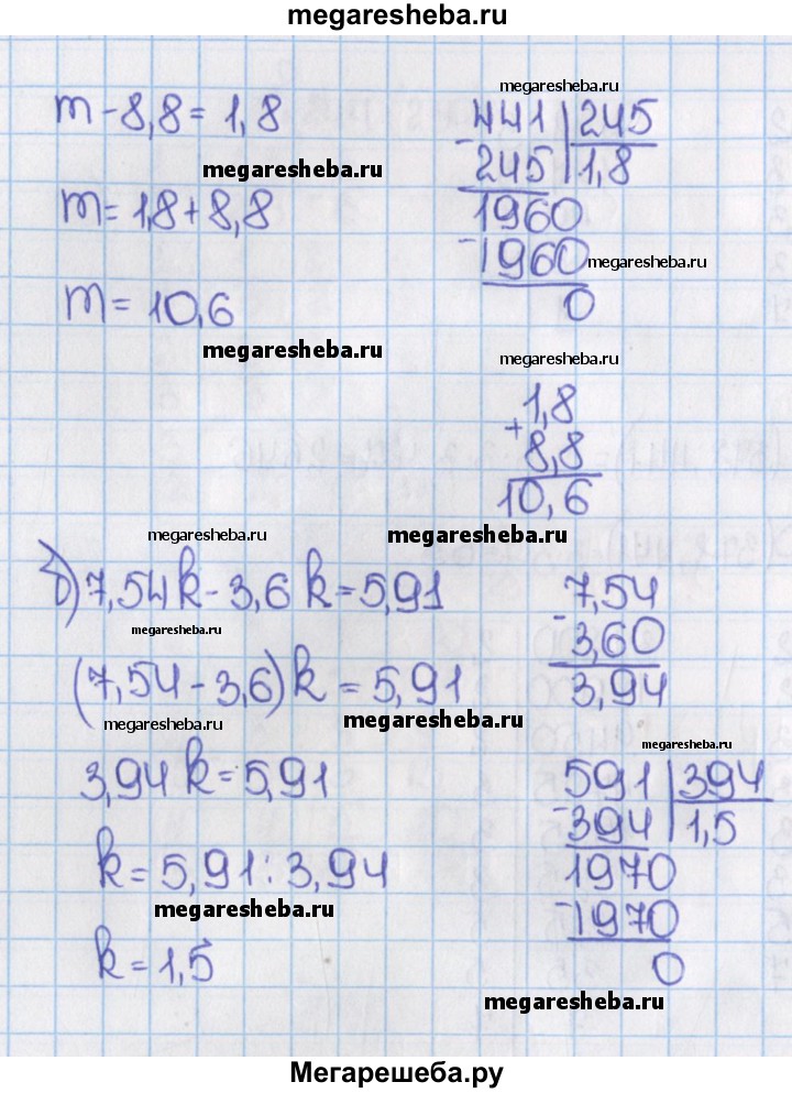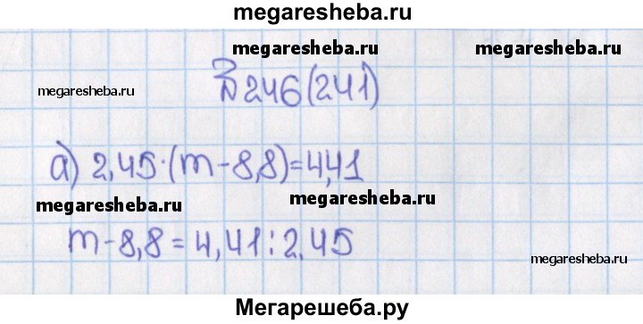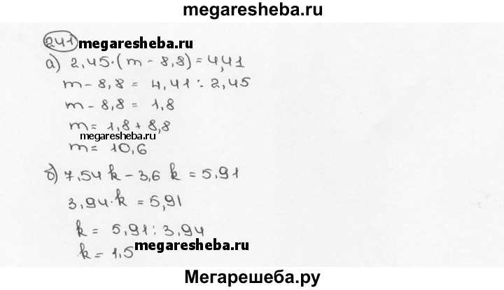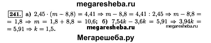 241. Решите уравнение: а) 2,45 * (m - 8,8) = 4,41; б) 7,54/е - 3,6k = 5,91.
