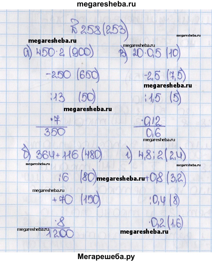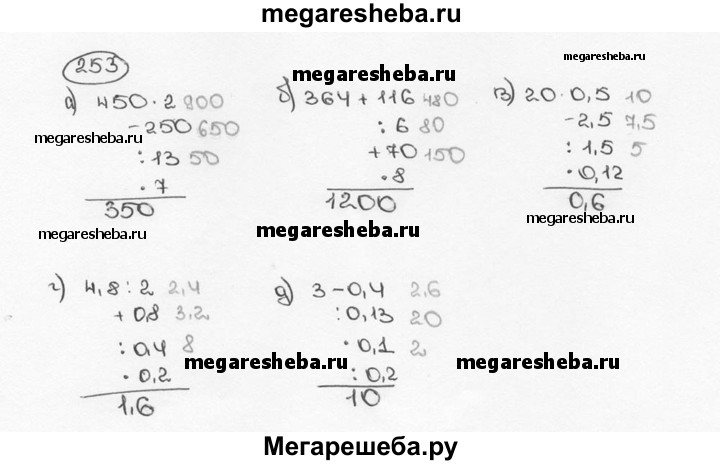 253. Вычислите устно: а) 450 * 2 – 250 : 13 * 7; б) 364 + 116 : 6 + 70 * 8; в) 20 - 0,5 - 2,5 : 1,5 *0,12; г) 4,8 : 2 + 0,8 : 0,4 * 0,2; д) 3 - 0,4 : 0,13 * 0,1 : 0,2.