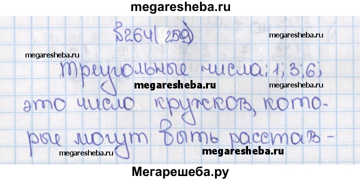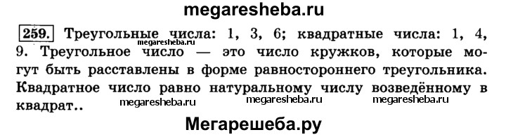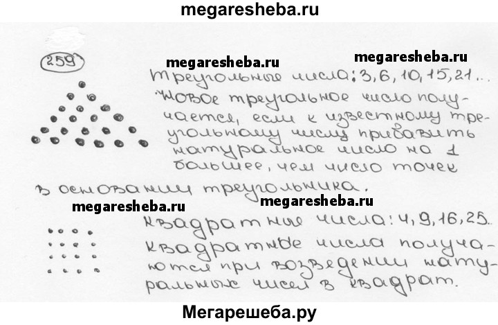 259. Древнегреческих, а также древнеиндийских математиков интересовали числа, которые соответствовали количеству точек, расположенных в виде некоторой геометрической фигуры — треугольника, квадрата и др. Такие числа называли фигурными. Например, число 10 называли треугольным, число 16 — квадратным (рис. 13). Такое представление помогало древним учёным изучать свойства чисел. Используя рисунок 13, попробуйте найти ещё несколько треугольных и квадратных чисел. Какими свойствами обладают эти числа? Подумайте, как можно находить треугольные и квадратные числа, используя ряд натуральных чисел.