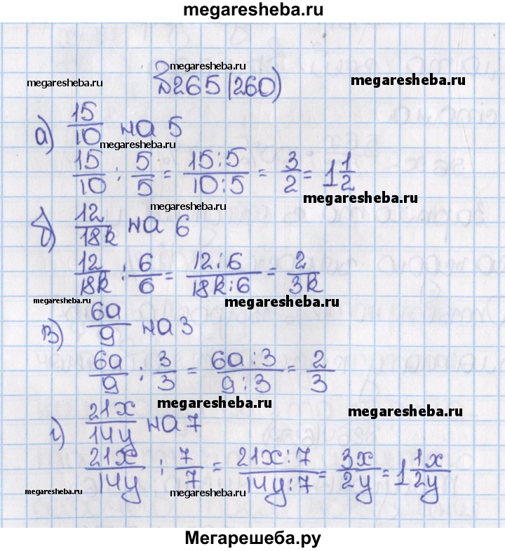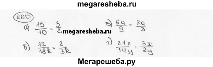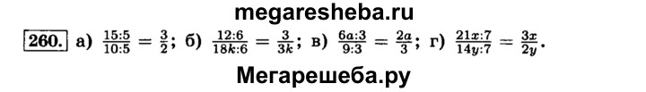 260. Разделите числитель и знаменатель дроби: а) 15/10 на 5; б) 12/18k на 6; в) 6a/9 на 3; г) 21x/14y на 7.