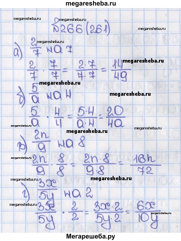 261. Умножьте числитель и знаменатель дроби: а) 2/7 на 7; б) 5/a на 4; в) 2n/9 на 8; г) 3x/5y на 2.