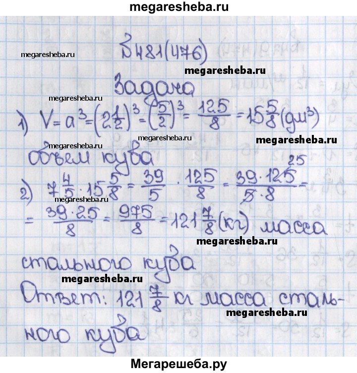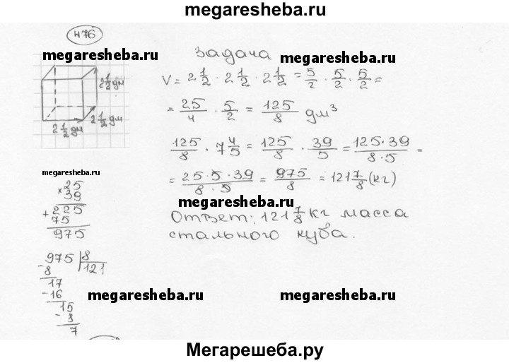 476. Масса 1 дм3 стали равна 7 4/5 кг. Найдите массу стального куба, ребро которого 2 1/2дм.