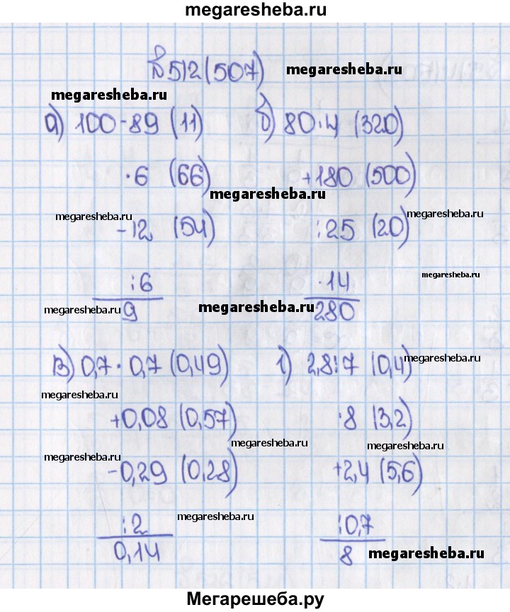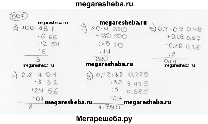 507. Вычислите устно: а) 100 – 89 * 6 – 12 : 6; б) 80 * 4 + 180 : 25 * 14; в) 0,7 * 0,7 + 0,08 – 0,29 : 2; г) 2,8 : 7 * 8 + 2,4 : 0,7; д) 0,72 : 3,2 + 3,2 : 5 * 0,7.
