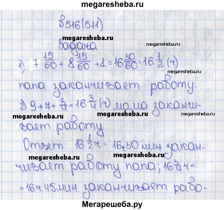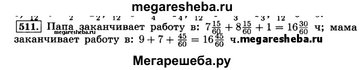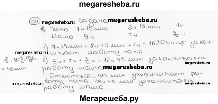 511. Папа начинает работу в 7 ч 15 мин, а мама — в 9 ч. Когда заканчивает работу каждый из них, если рабочий день папы 8 ч 15 мин и перерыв на обед 1 ч, а рабочий день мамы 7 ч и перерыв на обед 3/4 ч?