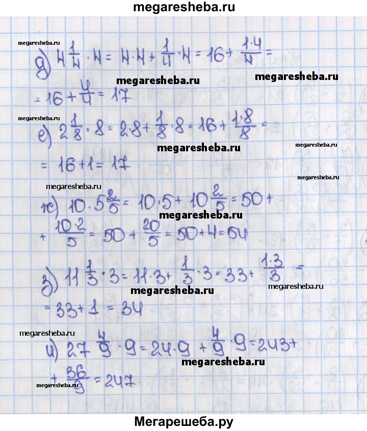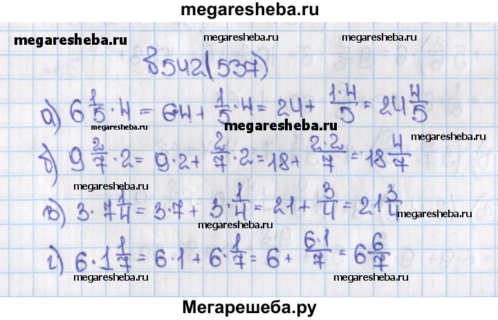 537. Выполните умножение: а) 6 1/5 * 4; б) 9 2/7 * 2; в) 3 * 7 1/4; г) 6 * 1 1/7; д) 4 1/4 * 4; е) 2 1/8 * 8; ж) 10 * 5 2/5; з) 11 1/3 * 3; и) 27 4/9 * 9; к) 12 9/13 *13.