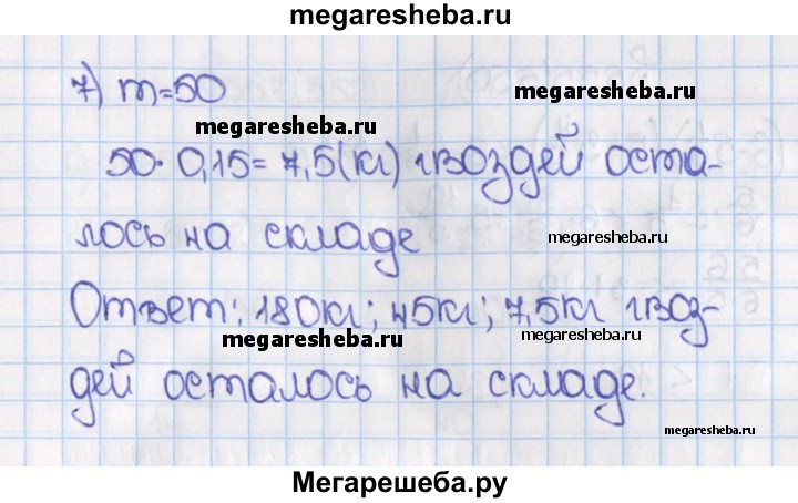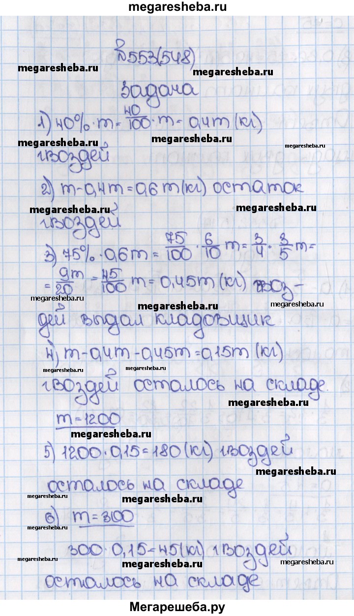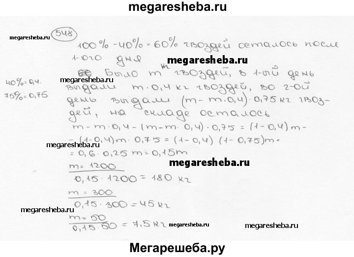 548. На складе было m кг гвоздей. Кладовщик в первый раз выдал 40% имевшихся гвоздей, во второй раз — 75% остатка. Сколько килограммов гвоздей осталось на складе? Найдите значение получившегося выражения при m = 1200; 300; 50.
