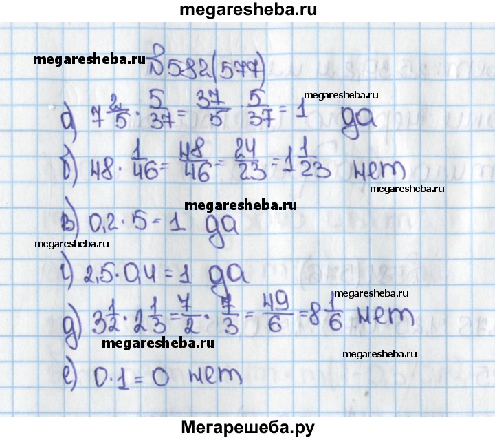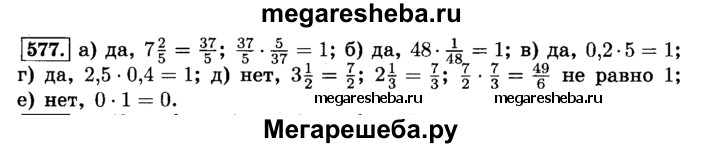 577. Будут ли взаимно обратными числа: а) 7 2/5 и 5/37; б) 48 и 1/46; в) 0,2 и 5; г) 2,5 и 0,4; д) 3 1/2 и 2 1/3; е) 0 и 1?