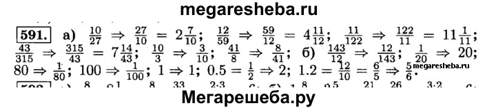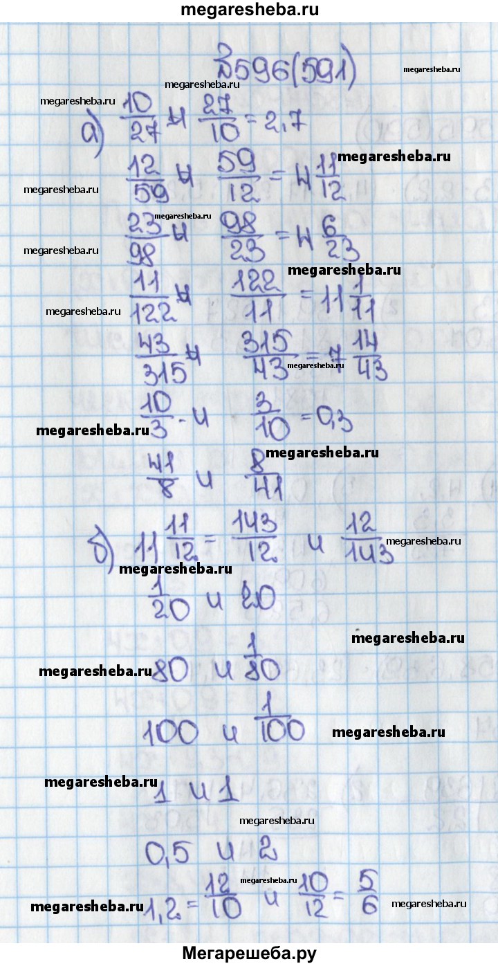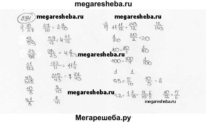 591. Найдите числа, обратные числам: а) 10/27; 12/59; 23/98; 11/122; 43/315; 10/3; 41/8; б) 11 11/12; 1/20; 80; 100; 1; 0,5; 1,2.