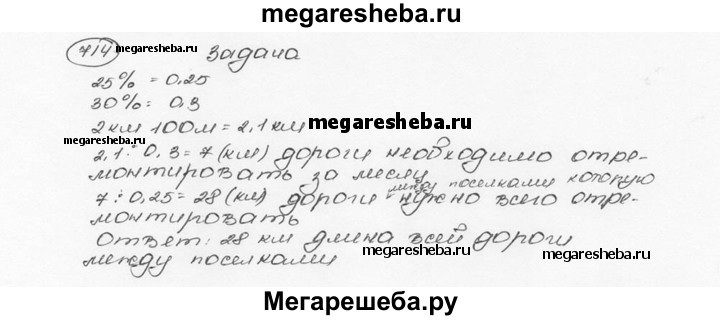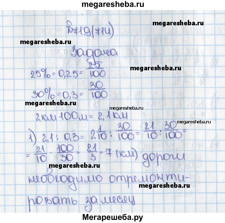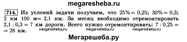 714. По плану бригада должна отремонтировать за месяц 25 % дороги между двумя посёлками. За первую неделю отремонтировали 2 км 100 м дороги, что составило 30% месячного плана. Какова длина всей дороги между посёлками?