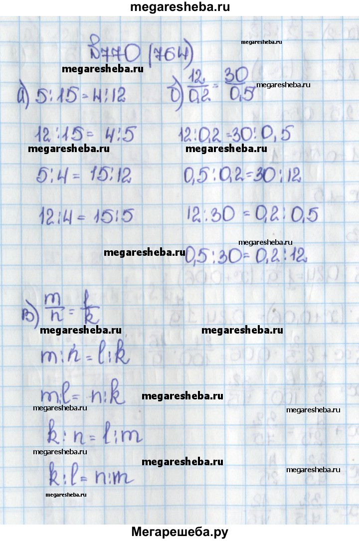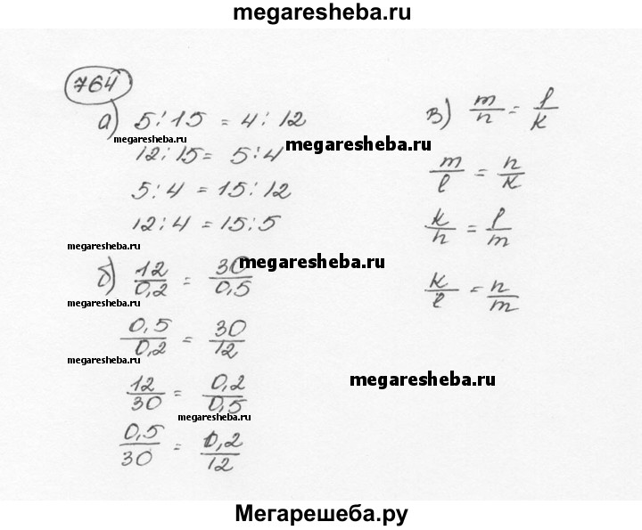 764. Переставив средние или крайние члены пропорции, составьте три новые верные пропорции из пропорции: а) 5 : 15 = 4 : 12; б) 12/0,2 = 30/0,5; в) m/n = l/k.