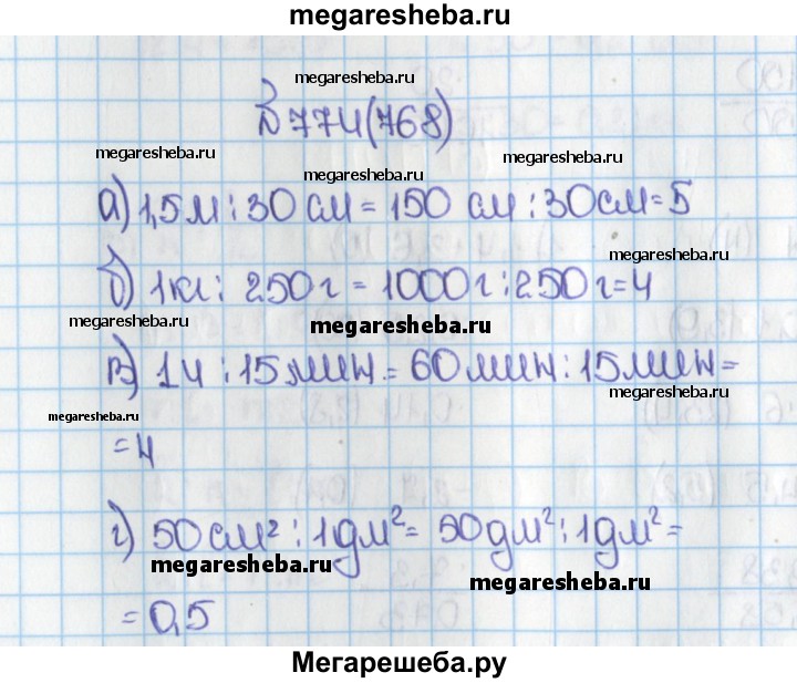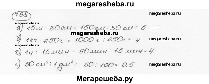 768. Найдите отношение величин: а) 1,5 м и 30 см; б) 1 кг и 250 г; в) 1 ч и 15 мин; г) 50 см2 и 1 дм2.