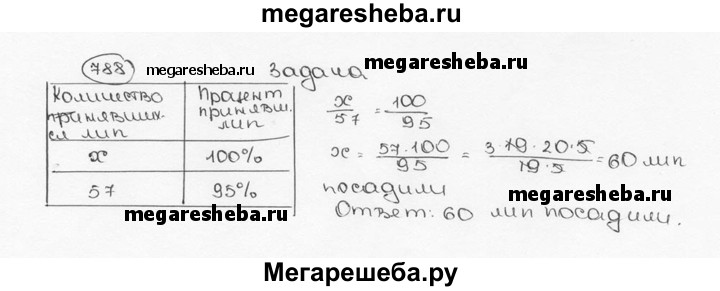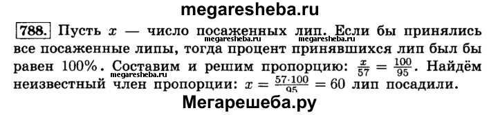 788. Весной при проведении работ по озеленению города на улице п< садили липы. Принялось 95% всех посаженных лип. Сколько посадил лип, если принялось 57 лип?