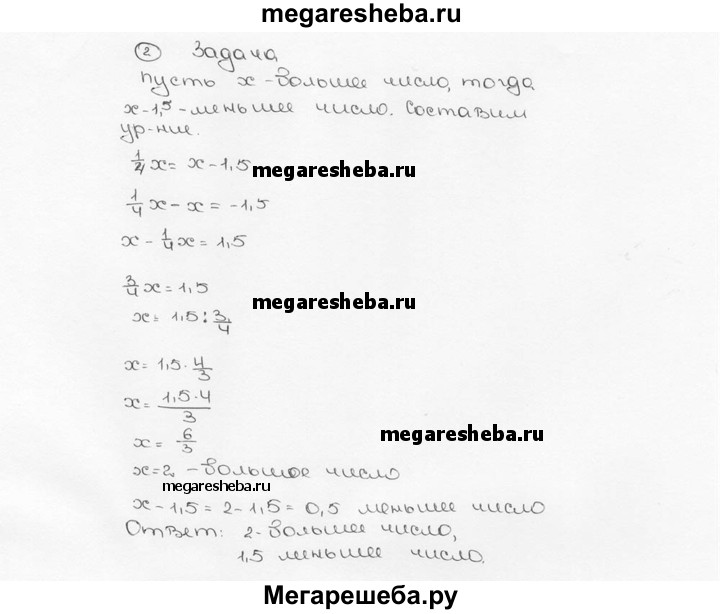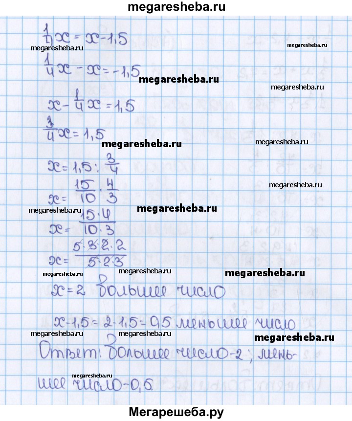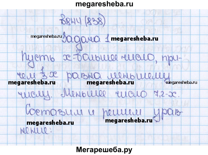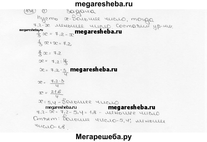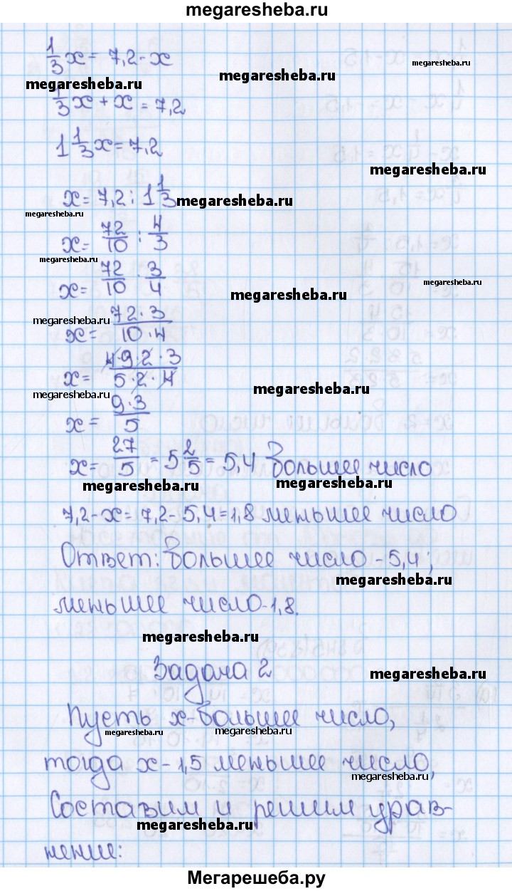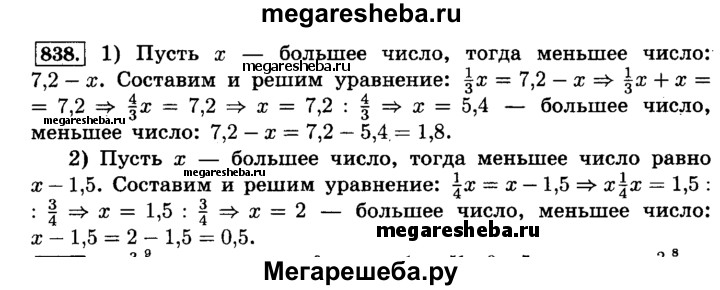 838. Решите задачу: 1) Сумма двух чисел 7,2, причём 1/3 большего числа равна меньшему числа. 2) Разность двух чисел 1,5, причём 1/4 большего числа равна меньшему числу. Найдите эти числа.