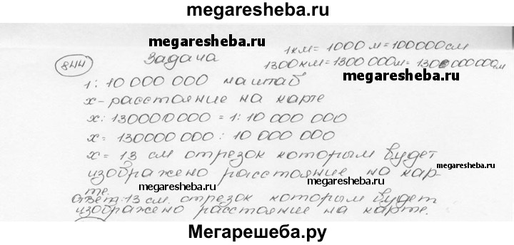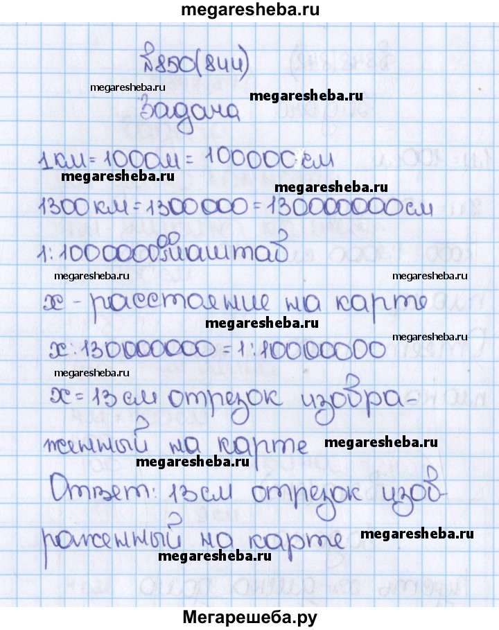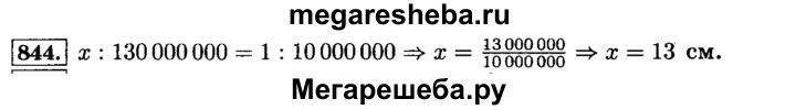 844. Расстояние между городами равно 1300 км. Каким отрезком будет изображено это расстояние на карте, масштаб которой 1 : 10 000 000?