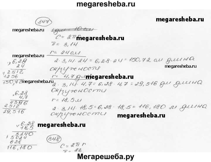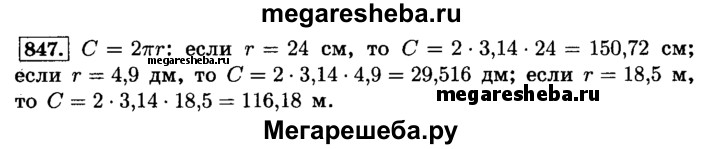847. Найдите длину окружности, радиус которой равен 24 см; 4,7 дм; 18,5 м. Число п округлите до сотых.