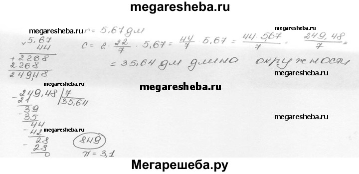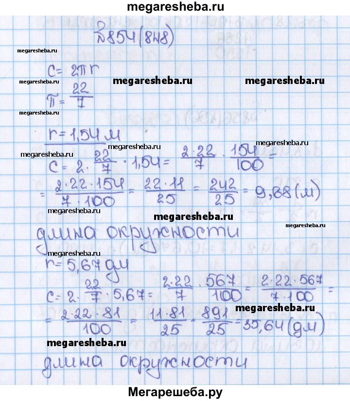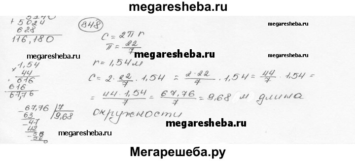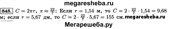 848. Чему равна длина окружности, если её радиус равен 1,54 м; 5,67 дм? Значение числа π возьмите равным 22/7.