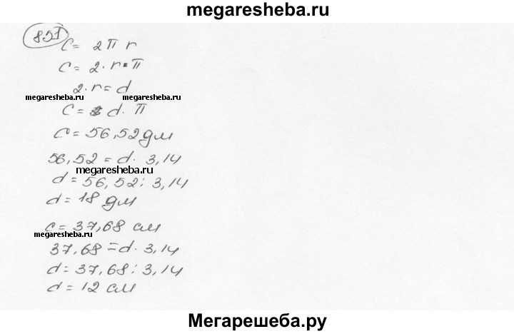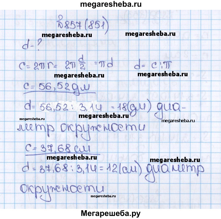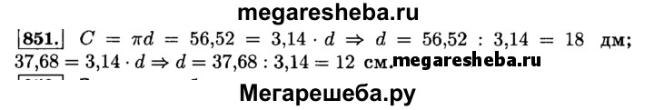 851. Определите диаметр окружности, если её длина равна 56,52 дм; 37,68 см π ≈ 3,14).