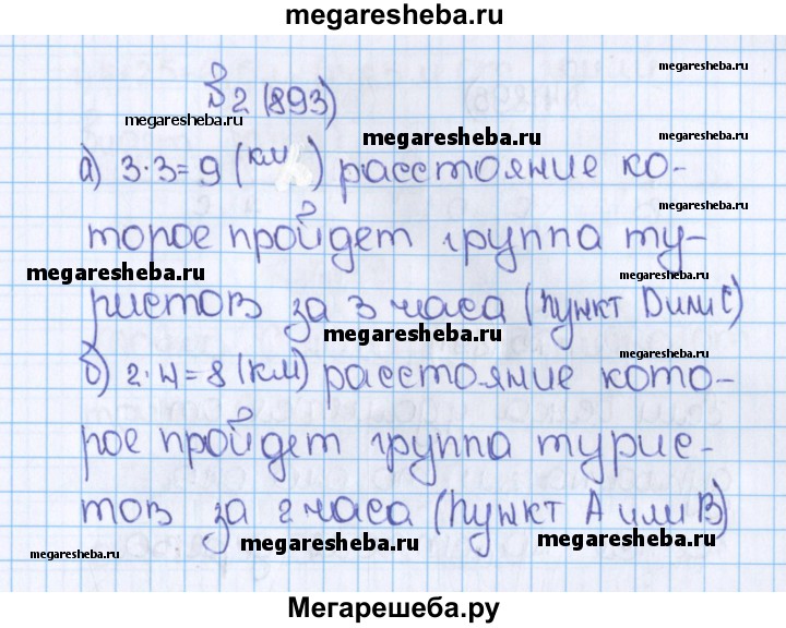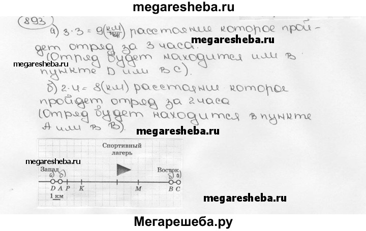 893. Из спортивного лагеря выходит группа туристов и движется по шоссе. Покажите, где будут находиться туристы: а) через 3 ч, если они идут со скоростью 3 км/ч; б) через 2 ч, если они идут со скоростью 4 км/ч. Что ещё надо знать, чтобы на каждый вопрос был только один ответ?