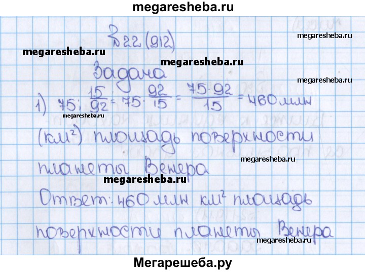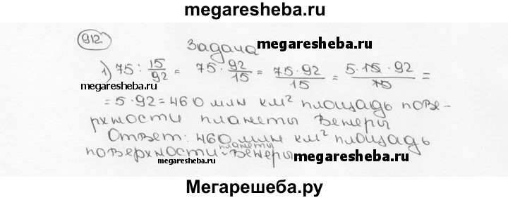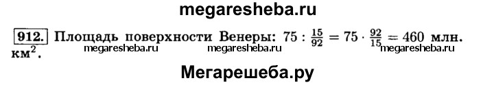 912. Площадь поверхности планеты Меркурий равна 75 млн км2 и составляет 15/92 площади поверхности планеты Венера. Найдите площадь поверхности планеты Венера.