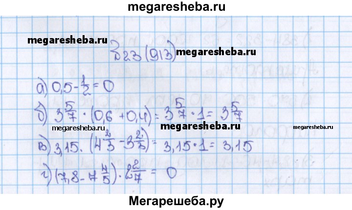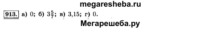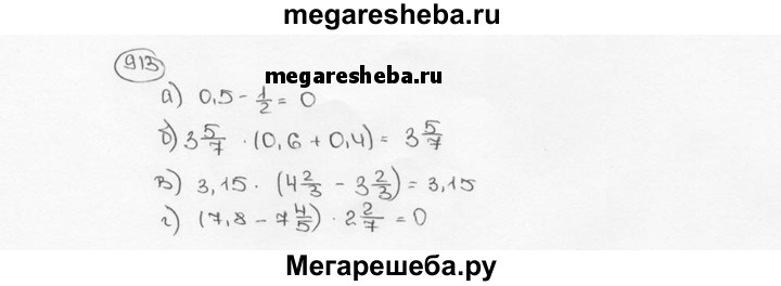 913. Вычислите устно: а) 0,5 – 1/2 б) 3*5/7 • (0,6 + 0,4); в) 3,15•(4*2/3 – 3*2/3); г) (7,8-7*4/5) • 2*2/7.