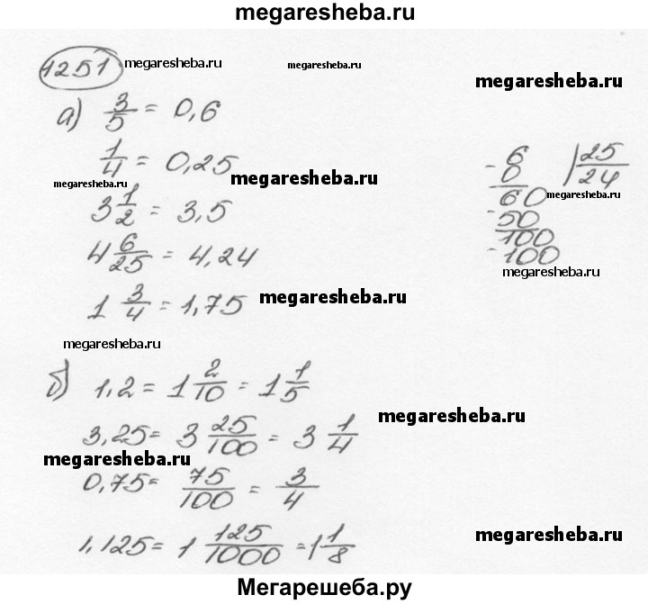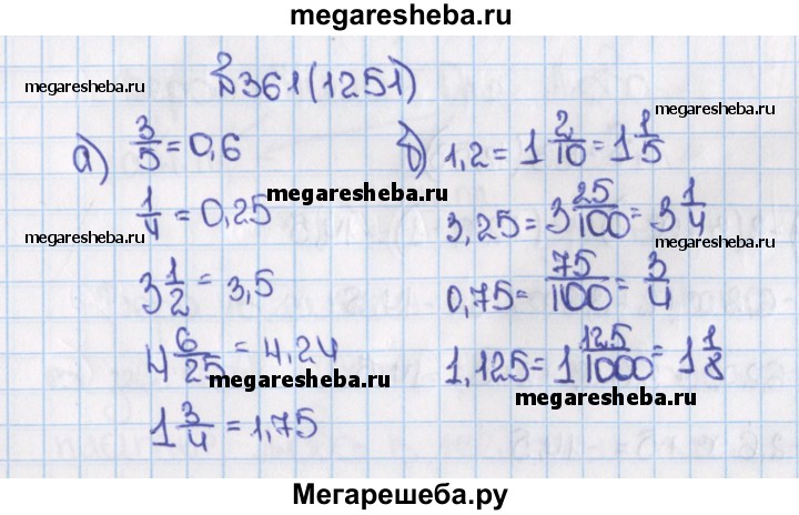 1251. Представьте: а) в виде десятичных дробей: 3/5; 1/4; 3*1/2; 4*6/25; 1*1/4. б) в виде обыкновенных дробей: 1,2; 3,25; 0,75; 1,125.