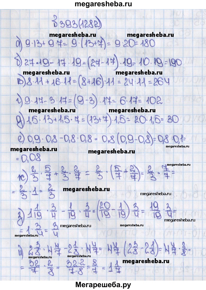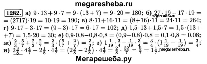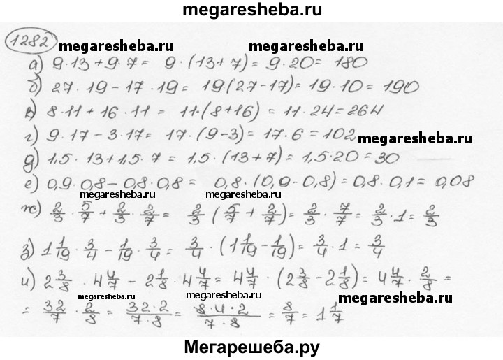1282. Выполните действия, применив распределительное свойство умножения: а) 9 • 13 + 9 • 7; б) 27-19-17-19; в) 8 • 11 + 16 • 11; г) 9 • 17 - 3 • 17; д) 1,5 • 13 + 1,5 • 7; е) 0,9 • 0,8 - 0,8 • 0,8; ж) 2/3 • 5/7 + 2/3 • 2/7; з) 1*1/19 • 3/4 -1/19 • 3/4; и) 2*3/8 • 4*4/7 – 2*1/8 • 4*4/7.