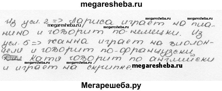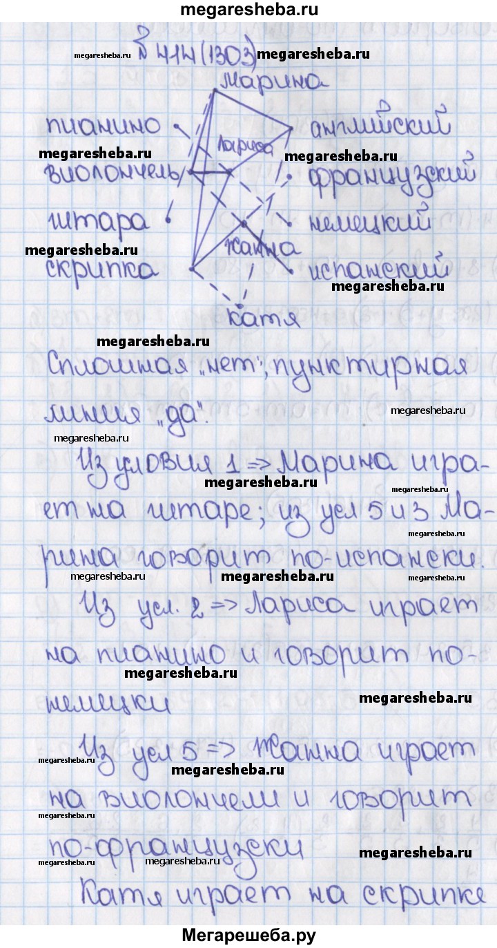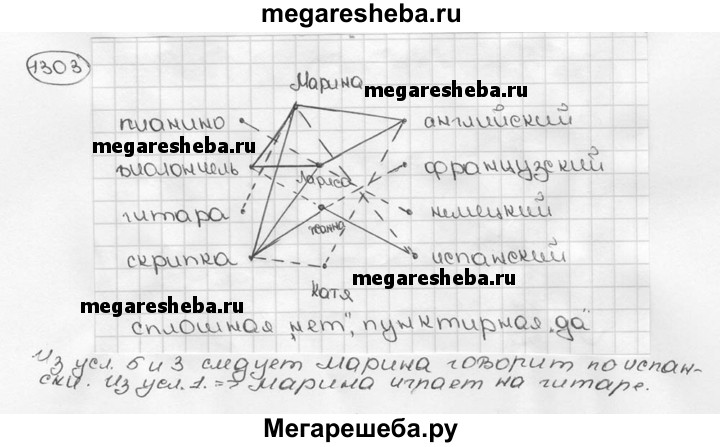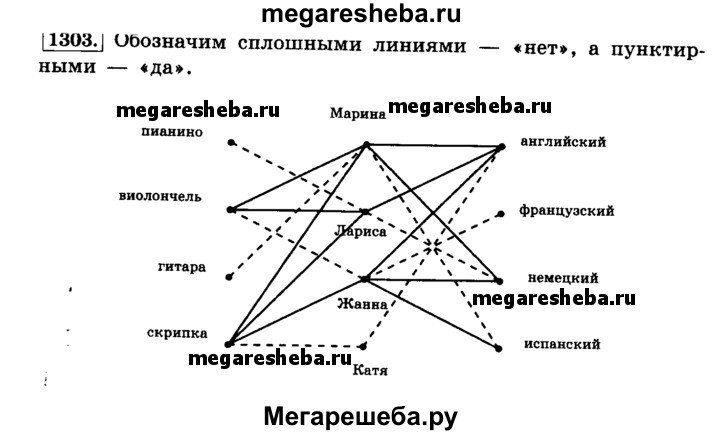 1303. Решите с помощью графа задачу: «Марина, Лариса, Жанна и Катя умеют играть на разных инструментах (пианино, виолончели, гитаре, скрипке), но каждая только на одном. Они же знают иностранные языки (английский, французский, немецкий, испанский), но каждая только один. Известно: 1) девушка, которая играет на гитаре, говорит по-испански; 2) Лариса не играет ни на скрипке, ни на виолончели и не знает английского языка; 3) Марина не играет ни на скрипке, ни на виолончели и не знает ни немецкого, ни английского языка; 4) девушка, которая говорит по-немецки, не играет на виолончели; 5) Жанна знает французский язык, но не играет на скрипке. Кто на каком инструменте играет и какой иностранный язык знает?»