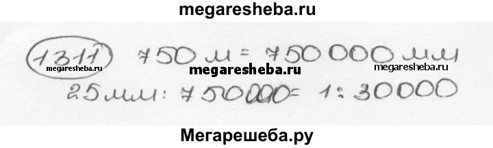 1311. Определите масштаб карты, если расстояние между двумя пунктами на местности 750 м, а на карте 25 мм.