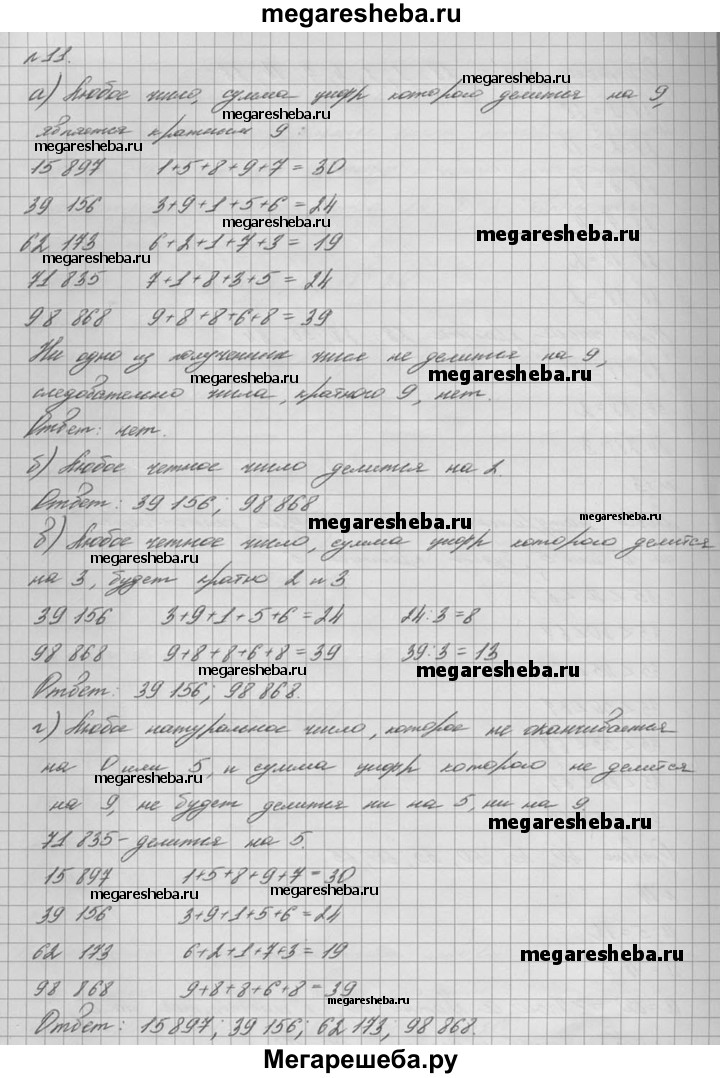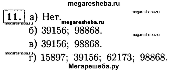11. Из чисел 15 897, 39 156, 62 173, 71 835 и 98 868 выпишите те, которые: а) кратны 9; б) делятся на 2; в) кратны 2 и 3; г) не делятся ни на 5, ни на 9.