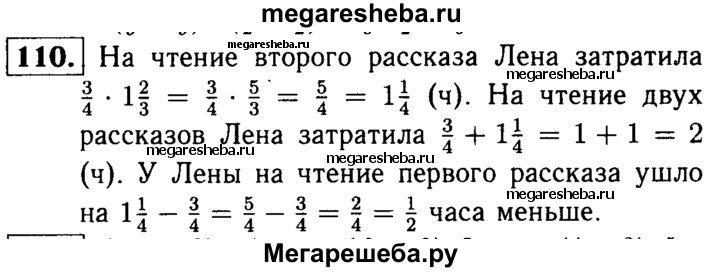 110. На чтение первого рассказа Лена затратила 3/4 ч, а на чтение второго рассказа — в 1*2/3 раза больше. Сколько времени Лена затратила на чтение двух рассказов? На сколько времени меньше у нее ушло на чтение первого рассказа, чем второго?