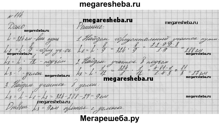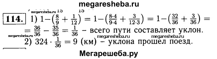 114. Поезд прошел 324 км. Горизонтальный участок пути составляет 8/9 всего пути, подъем —1/12 всего пути, а остальная часть пути имеет уклон. Сколько километров прошел поезд с уклона?