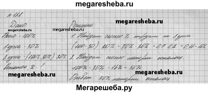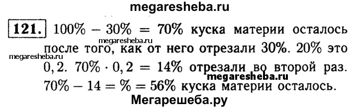 121. От куска материи отрезали сначала 30%, а потом еще 20% остатка. Сколько процентов куска материи осталось?