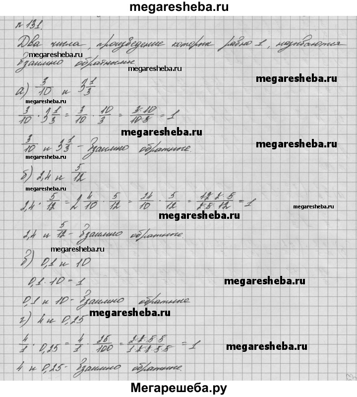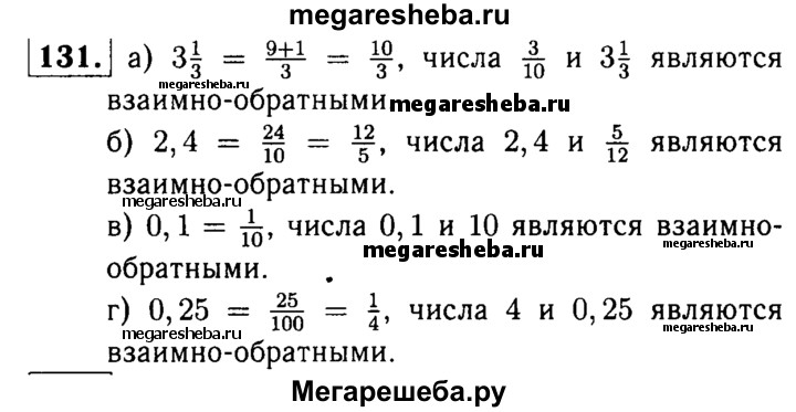 131. Являются ли взаимно-обратными числа: а) 3/10 и 3*1/3; б) 2,4 и 5/12; в) 0,1 и 10; г) 4 и 0,25?