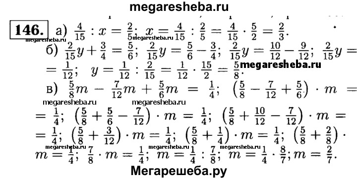 146. Решите уравнение: а) 4/15 : ч = 2/5; б) 2/15н + 3/4 = 5/6; в) 5/8m – 7/12m + 5/6m = 1/4.
