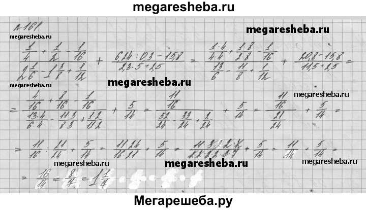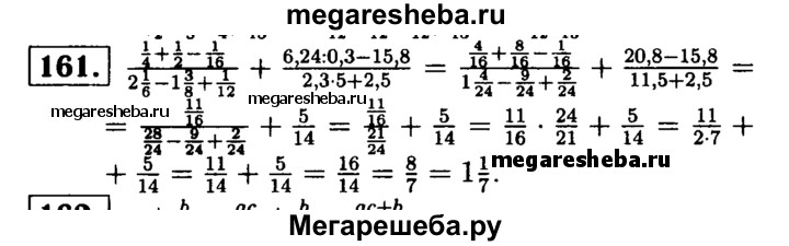 161. Выполните деление: 1/4 + 1/2 – 1/16 / 2*1/6 – 1*3/8 + 1/12 + 6,24 : 0,3 – 15,8 / 2,3 * 5 + 2,5.