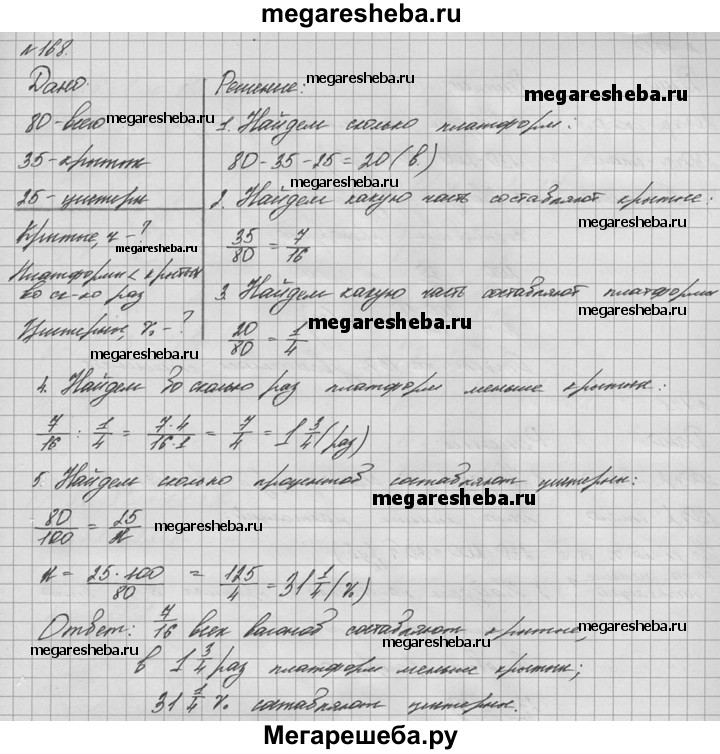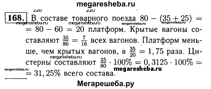 168. В составе товарного поезда 80 вагонов, причем крытых вагонов 35, цистерн 25, а остальные вагоны — платформы. Какую часть всех вагонов составляют крытые вагоны? Во сколько раз платформ меньше, чем крытых вагонов? Сколько процентов всего состава составляют цистерны?