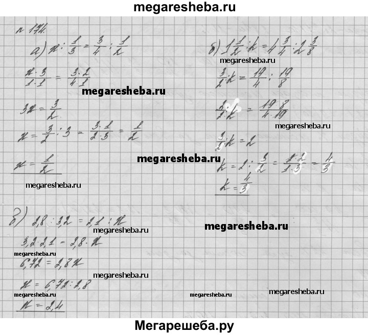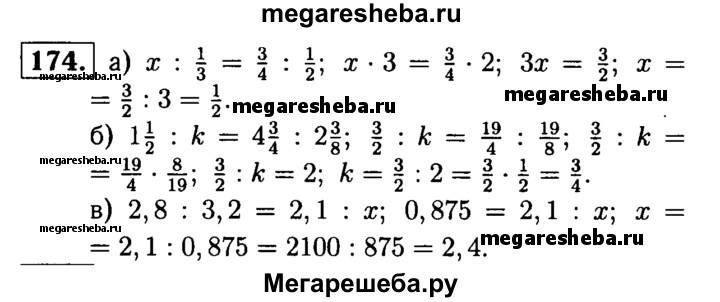 174. Решите уравнение: а) x : 1/3 = 3/4 : ½; б) 1*1/2 :k = 4*3/4 : 2*3/8; в) 2,8 : 3,2 = 2,1: x.