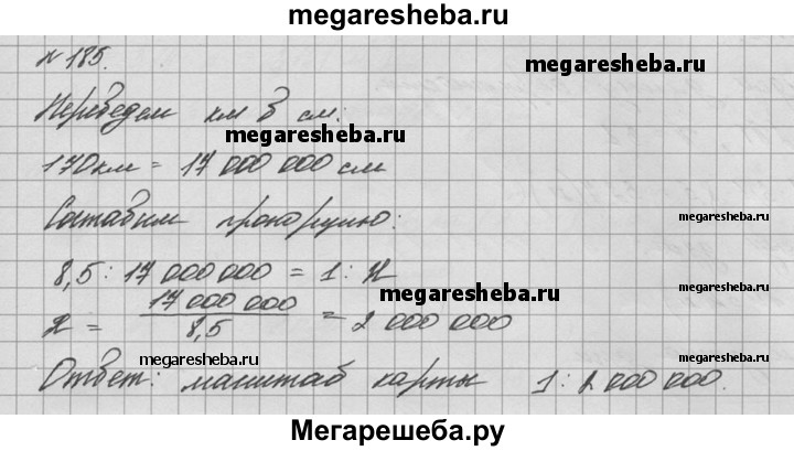 185. Расстояние между пунктами X и У на карте равно 8,5 см, а на местности 170 км. Найдите масштаб карты.