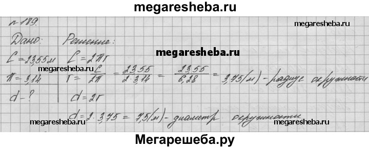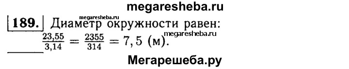189. Найдите диаметр окружности, если длина окружности равна 23,55 м. Число π округлите до сотых.