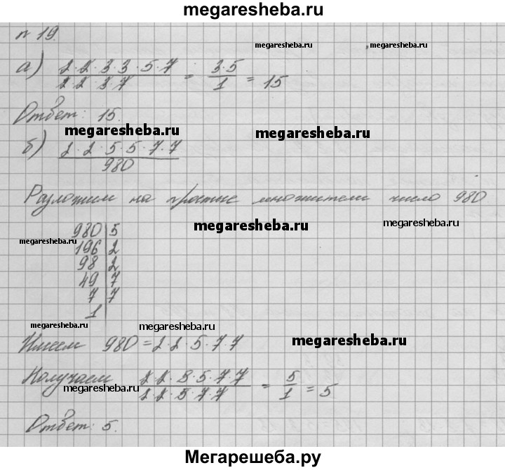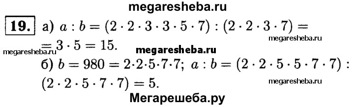 19. Найдите частное от деления числа а на число b, если: а)а = 2* 2* 3* 3 * 5*7, b = 2 *2* 3 *7; б) а = 2 * 2 * 5 * 5 * 7 * 7, b=980.
