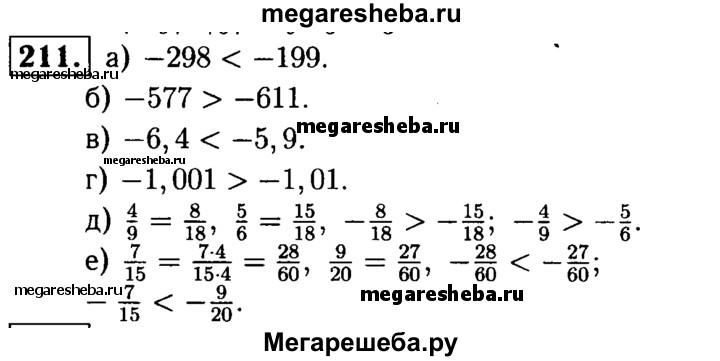 211. Сравните: а) -298 и -199; б) -577 и -611; в) -6,4 и -5,9; г) -1,001 и -1,01; д) -4/9 и -5/6; е) -7/15 и -9/20.