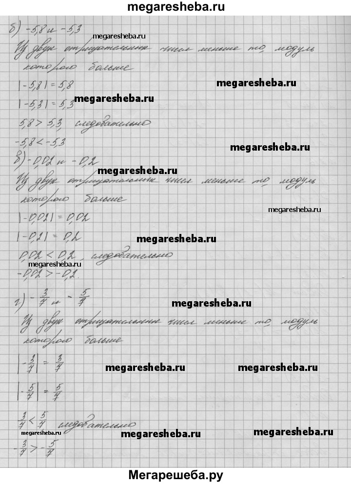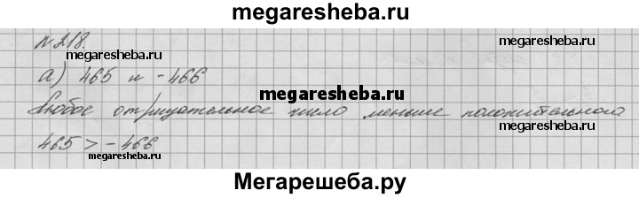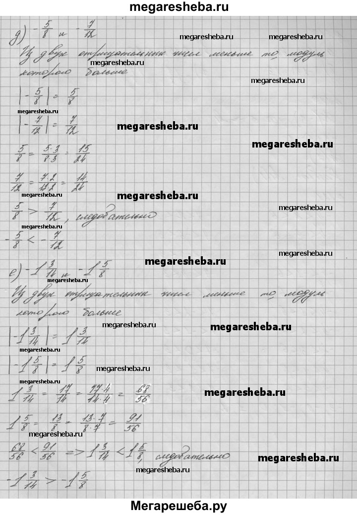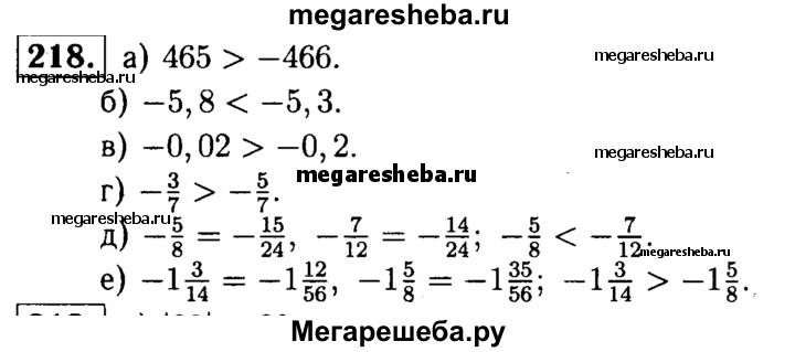 218. Сравните: а) 465 и -466; б) -5,8 и -5,3; в) -0,02 и -0,2; г) -3/7 и -5/7; д)-5/8 и – 7/12; е) -1*3/14 и – 1*5/8.