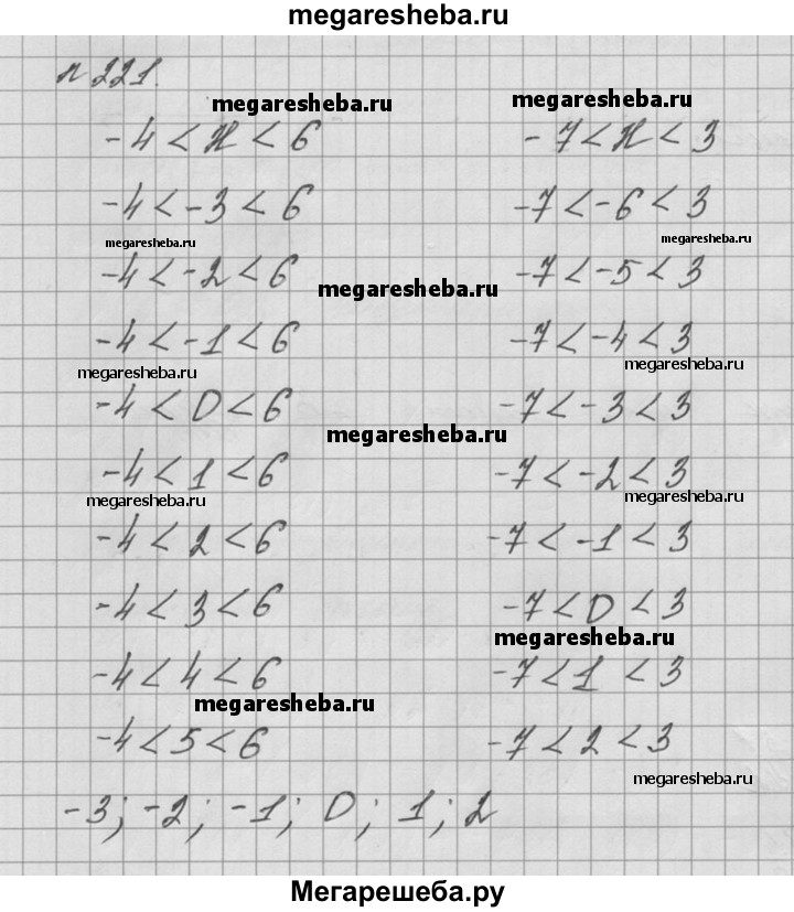 221. Запишите все целые числа, которые являются одновременно решениями неравенств -4 < х < 6 и -7 < х < 3.