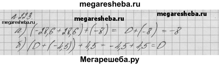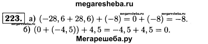 223. Найдите значение выражения: а) (-28,6 + 28,6) + (-8); б) (0 + (-4,5)) + 4,5.