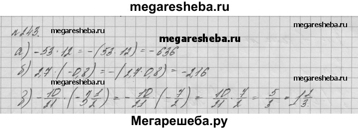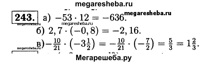 243. Выполните умножение: а) -53 * 12; б) 2,7 * (-0,8); в) -10/21 * (-3*1/2).