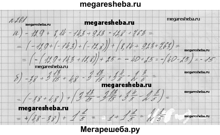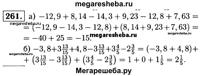 261. Найдите значение выражения: а) -12,9 + 8,14 - 14,3 + 9,23 - 12,8 + 7,63; б) -3,8 + 3*13/15 + 4,8 – 3*13/15 + З*4/5 -2*3/5.